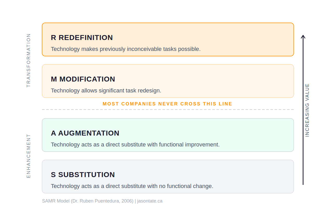 Most companies are stuck at Substitution. At best, they reach Augmentation. That’s where “digital transformation” stopped for the majority of organizations I’ve worked with. AI is following the same pattern.